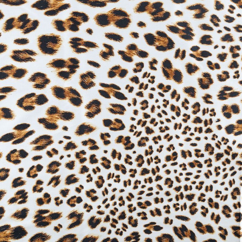 Итальянский коттон белого цвета с анималистическим принтом в природных оттенках. Поверхность гладкая, матовая, ткань средней плотности,  не толстая, хорошо держит форму, тянется за счет эластана в составе. Подойдет для пошива костюма, жакета, юбки, платья, брюк или шорт.