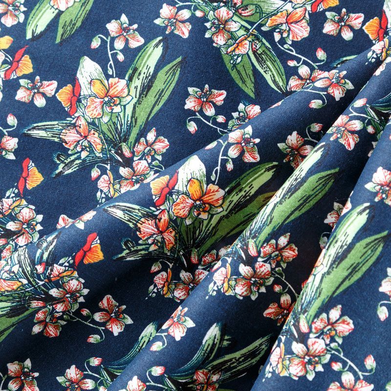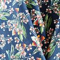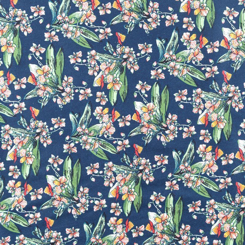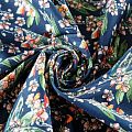 Коттон плательно-костюмной плотности темно-синего оттенка с цветочным принтом. Поверхность гладкая, матовая, хорошо держит форму, тянется за счет эластана в составе. Подойдет для пошива костюма, жакета, юбки, платья, брюк или шорт.