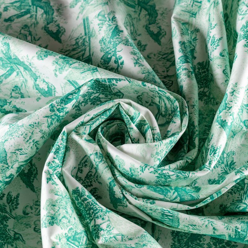 Изысканный и узнаваемый французский принт туаль-де-жуи зеленого оттенка на благородном молочном фоне - это не только эстетическое удовольствие, но и непринужденность, с которой можно составлять комплекты. Ткань средней плотности, мягкая, приятная на ощупь, эластичная, держит форму, смотрится красиво, женственно. Подойдет для пошива костюма жакета, юбки, платья и других изделий.