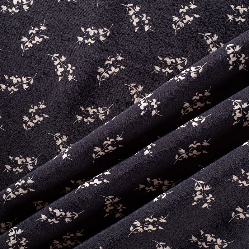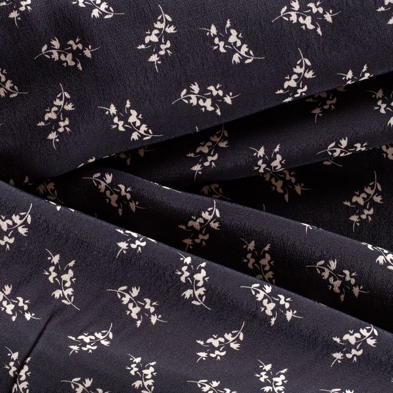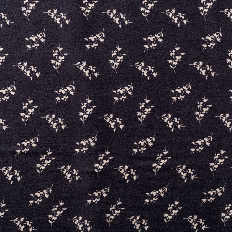 Итальянская натуральная вискозная ткань черного цвета с растительным принтом. Ткань легкая, хорошо тянется, драпируется струящимися складками, приятная и комфортная в носке. Материал слегка мнется, имеет креповую фактуру. Идеально подходит для пошива  платьев, юбок, блуз, комбинезонов, костюмов, туник, кардиганов.