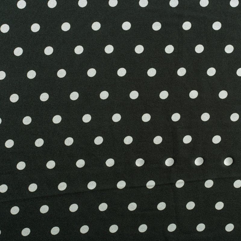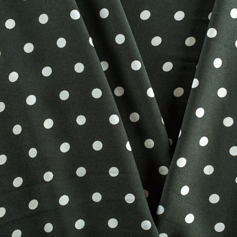 Плательный креп с принтом в горох. Ткань средней плотности, не толстая, пластичная, поверхность полотна матовая, с характерной мелкозернистой фактурой, прочная, хорошо драпирующаяся. Превосходно подойдет для пошива стильного костюма, юбки, платья, комбинезона, топа, брюк.
