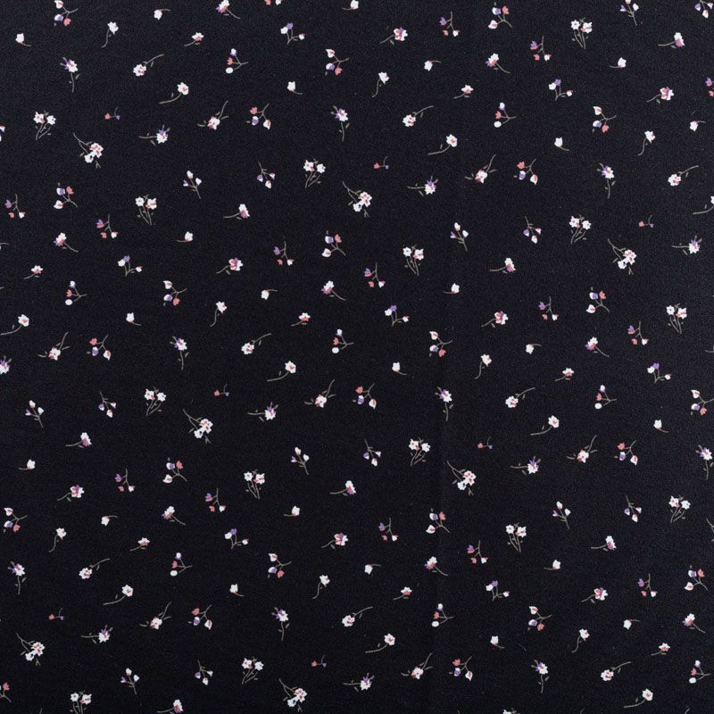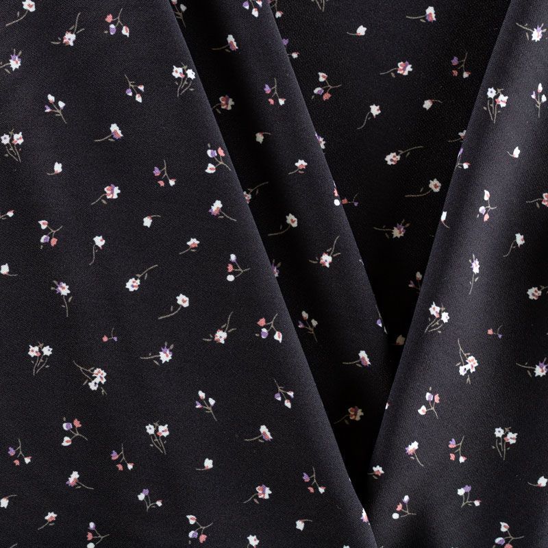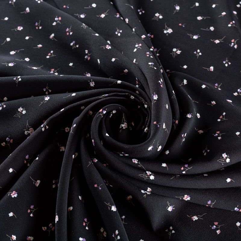 Плательный креп с мелким цветочным принтом. Ткань средней плотности, не толстая, пластичная, поверхность полотна матовая, с характерной мелкозернистой фактурой, прочная, практически не мнется, хорошо драпируется. Превосходно подойдет для пошива стильного костюма, юбки, платья, комбинезона, топа, брюк.