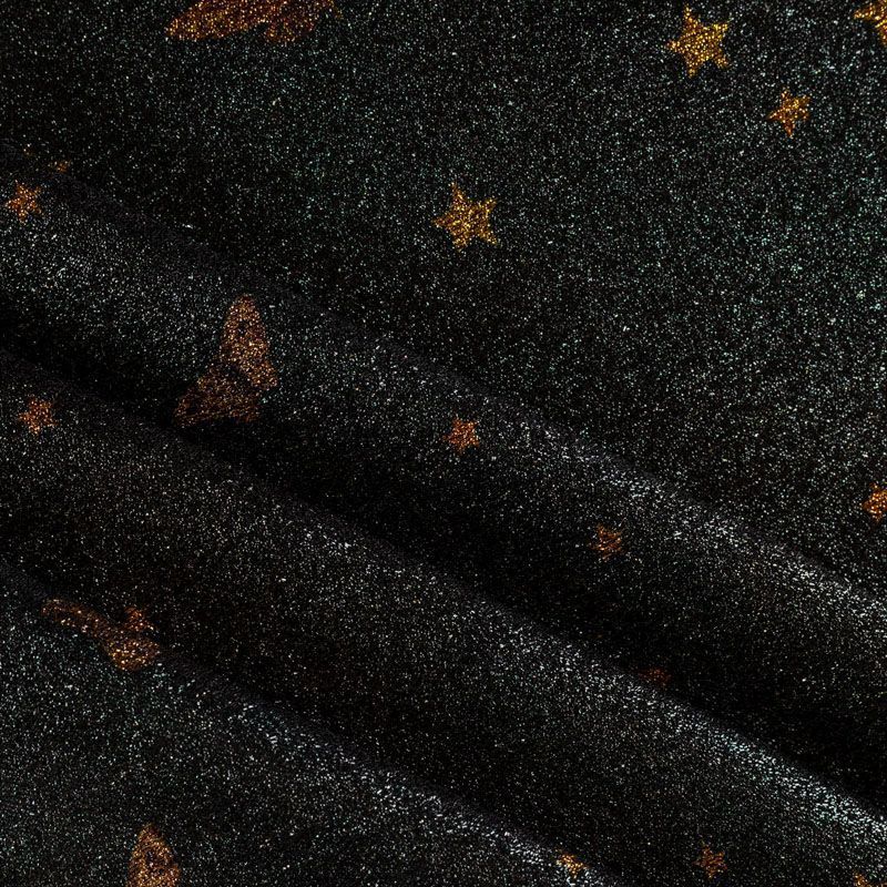 Шелковый креп-шифон черного цвета, полностью расшитый черно-золотой люрексовой нитью с фантазийным принтом. Не просвечивает, тянется, шикарно смотрится в драпировке. Подойдет для пошива платья, комбинезона, топа, блузки, свободных брюк.