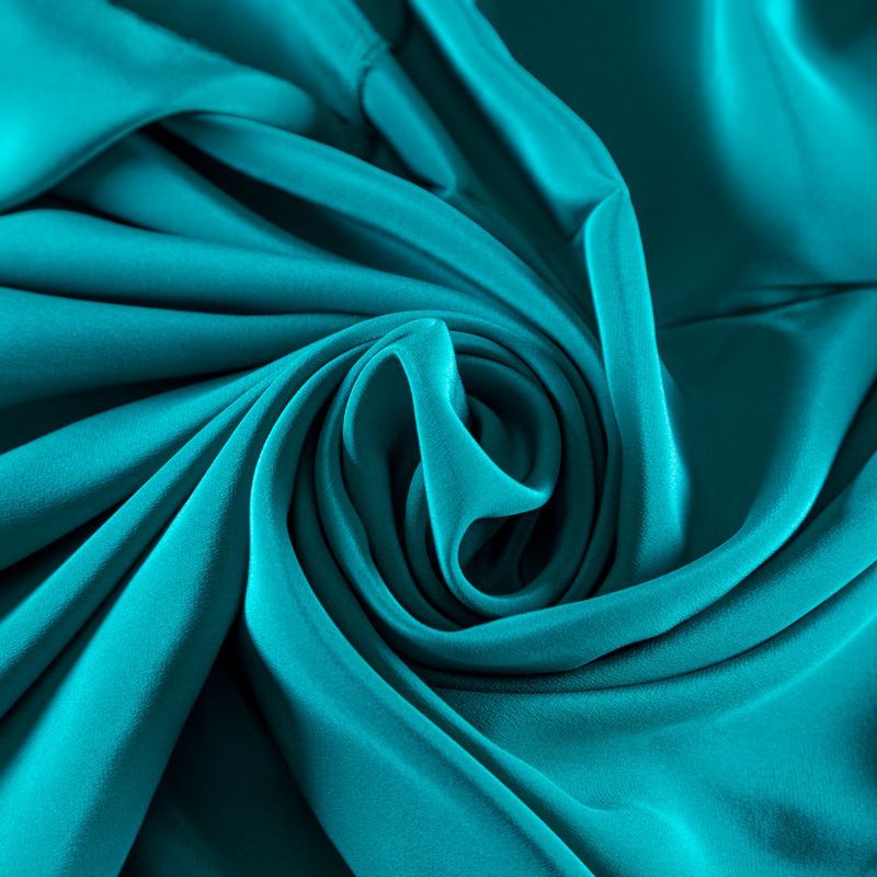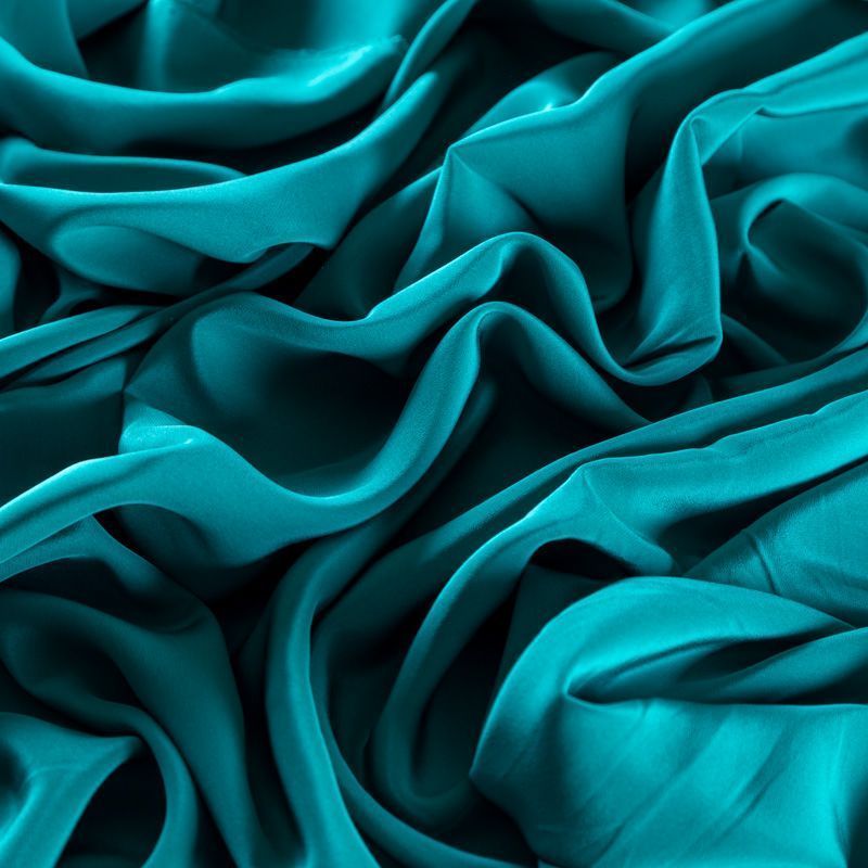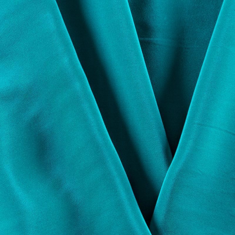 Итальянский натуральный шелковый крепдешин в бирюзовом оттенке, фактурный, легкий и струящийся, слегка просвечивает, отлично драпируется. Идеально подойдет для пошива платьев и сарафанов расклешенных моделей, с воланами, летящих юбок, топов, блузки, юбки, широких брюк, костюма в пижамном стиле.