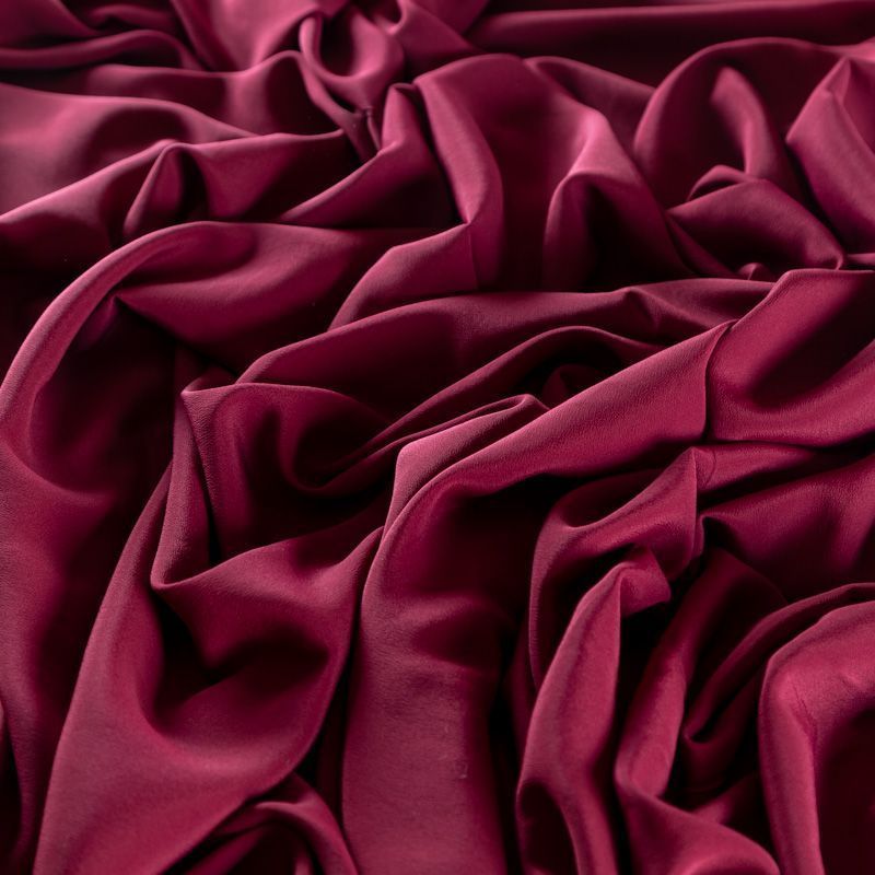 Итальянский натуральный шелковый крепдешин в ягодном оттенке, фактурный, легкий и струящийся, слегка просвечивает, отлично драпируется., тянется за счет эластана в составе. Идеально подойдет для пошива платьев и сарафанов расклешенных моделей, с воланами, летящих юбок, топов, блузки, юбки, широких брюк, костюма в пижамном стиле.