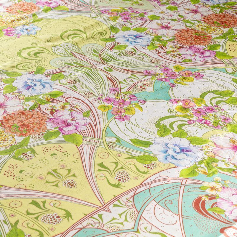 Натуральный шелковый крепдешин с матовой поверхностью, легкий, струящийся, хорошо драпируется. Цветочный принт выполнен в нежных пастельных оттенках, который будет уместен для пошива летнего сарафана, платья, блузки, костюма в пижамном стиле, широких брюк или юбки.