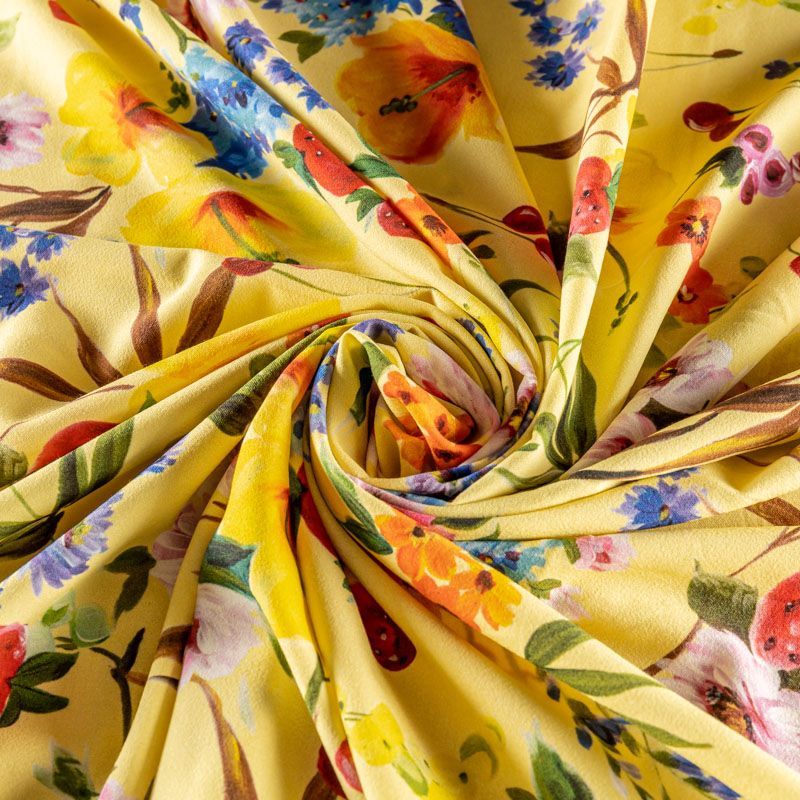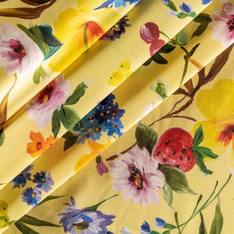 Натуральный шелковый крепдешин с добавлением хлопка с матовой поверхностью, легкий, струящийся, хорошо драпируется. Ткань немного просвечивает, хорошо тянется за счет эластана в составе. Яркий ягодно-цветочный принт на актуальном в этом сезоне желтом фоне прекрасно подойдет для пошива летнего сарафана, платья, блузки, костюма в пижамном стиле, широких брюк или юбки.