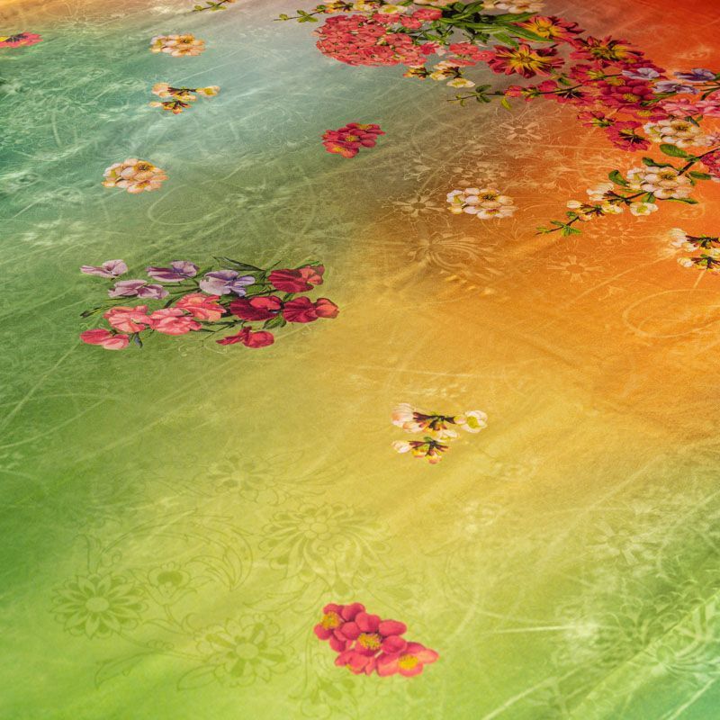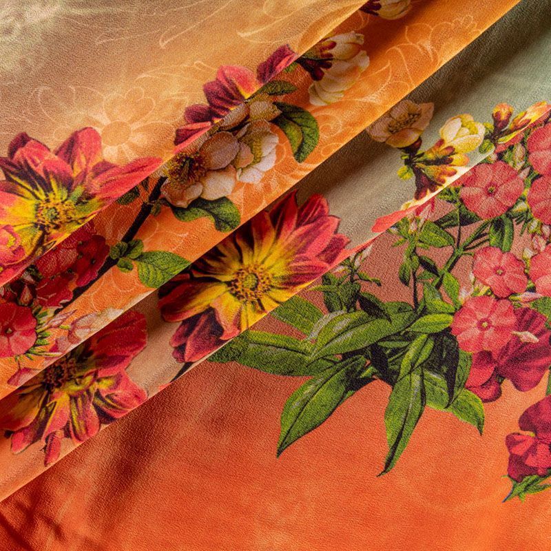 Натуральный шелковый крепдешин с эффектом деграде с плавным переходом от кораллового до ярко-зеленого цвета, дополненный по кромке цветочным принтом, подойдет для ценителей ярких образов. Ткань имеет матовую поверхность, легкая, тонкая, струящаяся, хорошо драпируется, набирается объемом. Будет идеальна для пошива летнего сарафана, платья, блузки, костюма в пижамном стиле, широких брюк или юбки.