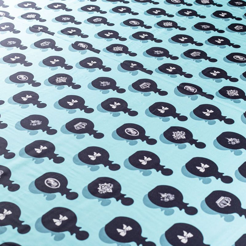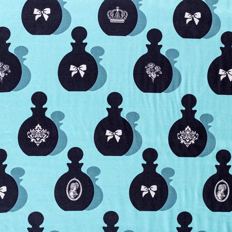Итальянский крепдешин с матовой лицевой поверхностью со стилизованными флаконами духов на освежающем ментовом фоне, тонкий, слегка прозрачный, отлично драпируется, легкий и струящийся. Идеально подойдет для пошива платьев и сарафанов расклешенных моделей, с воланами, летящих юбок, топов, блузки, костюма в пижамном стиле.