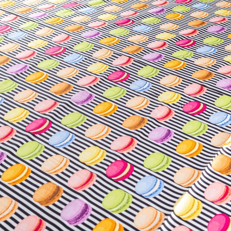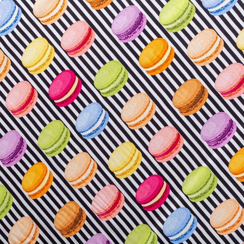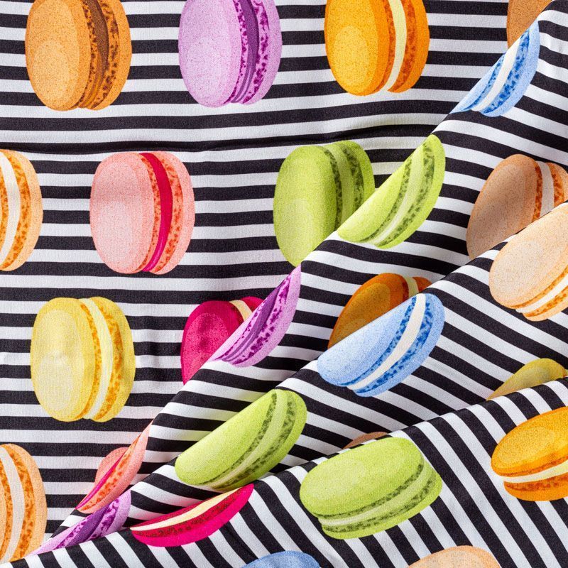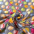 Итальянский крепдешин с матовой лицевой поверхностью с "вкусным" ярким принтом на полосатом фоне, тонкий, слегка прозрачный, отлично драпируется, не много тянется за счет эластана в составе, легкий и струящийся. Идеально подойдет для пошива платьев и сарафанов расклешенных моделей, с воланами, летящих юбок, топов, блузки, костюма в пижамном стиле.