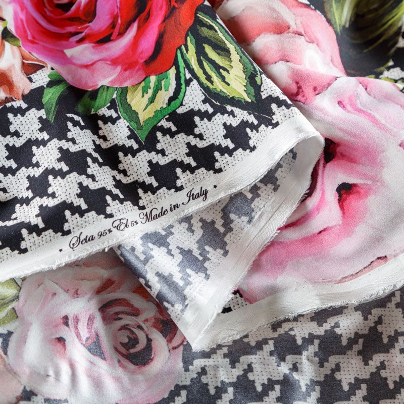 Итальянский крепдешин с матовой лицевой поверхностью с принтом гусиная лапка и цветами, тонкий, слегка прозрачный, отлично драпируется, тянется за счет эластана в составе, легкий и струящийся. Идеально подойдет для пошива платьев и сарафанов расклешенных моделей, с воланами, летящих юбок, топов, блузки, костюма в пижамном стиле.