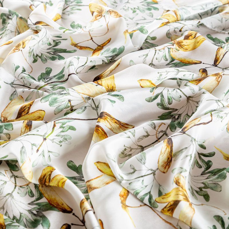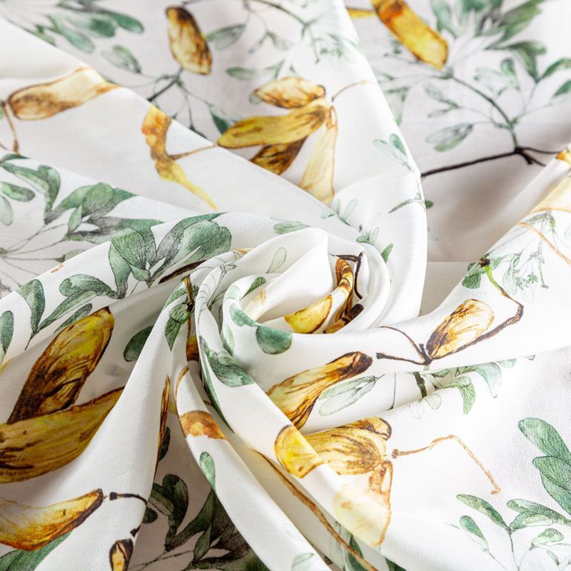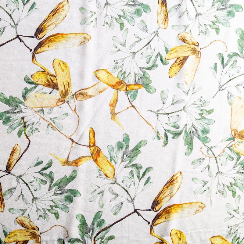 Итальянский плательно-блузочный крепдешин из натурального шелка теплого молочного оттенка с растительным принтом. В рисунке использованы различные оттенки желтого, оливкового, зеленого и черного цветов. Ткань легкая, струящаяся, приятная к телу с матовой мелкозернистой поверхностью, хорошо драпируется, образуя мягкие складки. Подходит для пошива платья, юбки, блузки, рубашки, топа, комбинезона, летнего костюма с брюками или шортами.