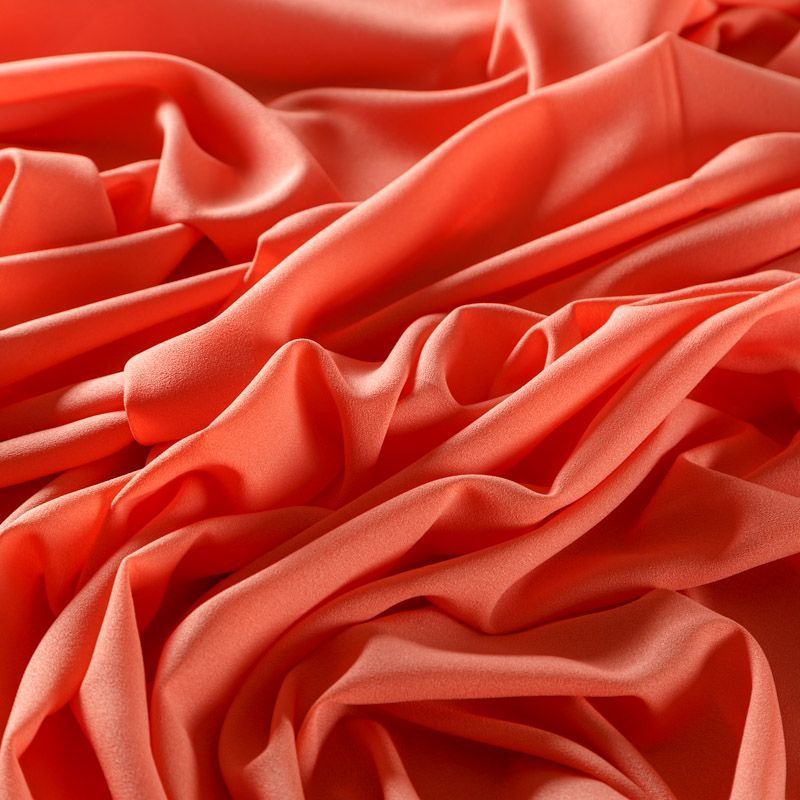 Крепдешин яркого кораллового оттенка, тонкий, легкий, фактурный, приятный на ощупь. Очень пластичный, тянется за счет эластана в составе, прекрасно драпируется и струится. Ткань слегка просвечивает, можно использовать подклад. Идеально будет смотреться в платье, юбке, тунике, рубашке или блузке.