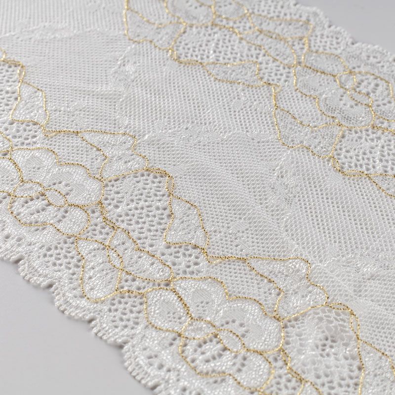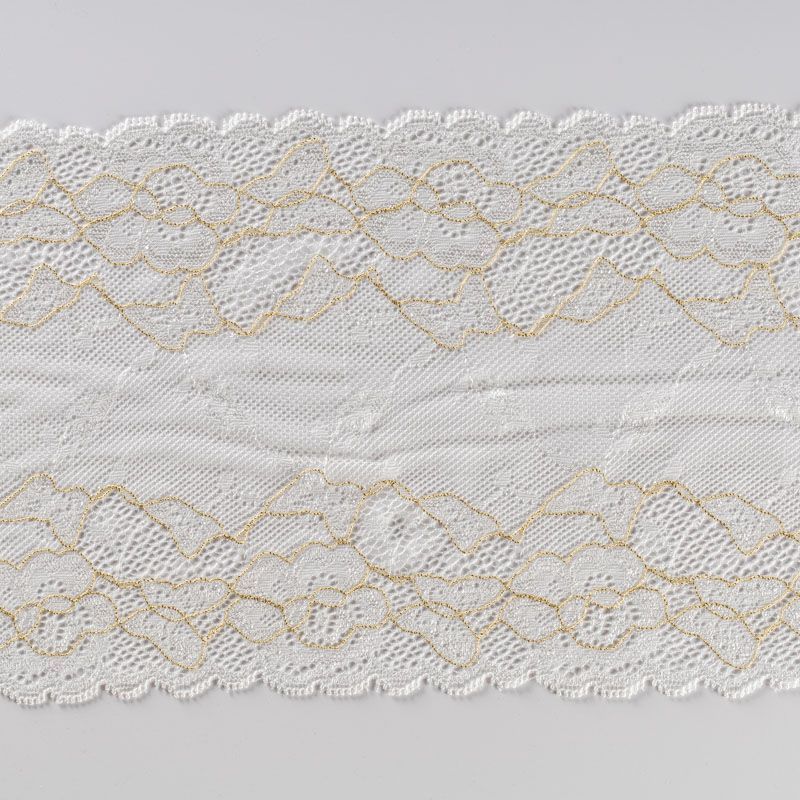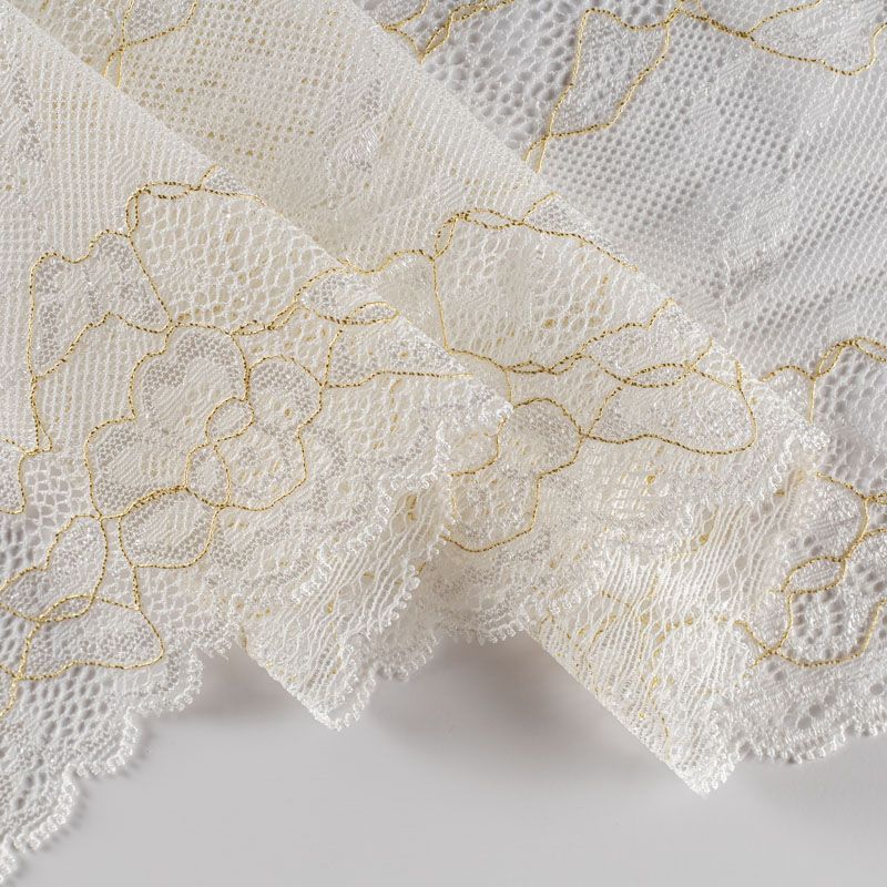 Эластичное кружево сочетает в себе мягкость, прочность и красоту, благодаря своей упругости оно долго не теряет первоначальную форму. Используется для пошива нижнего белья, а так же применяется как отделочный декор в одежде.