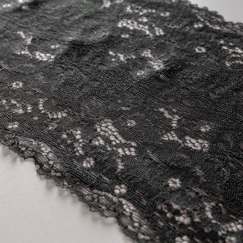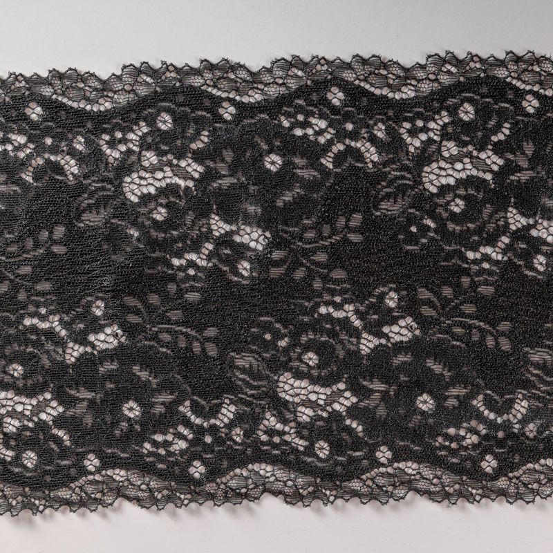 Эластичное кружево сочетает в себе мягкость, прочность и красоту, благодаря своей упругости оно долго не теряет первоначальную форму. Используется для пошива нижнего белья, а так же применяется как отделочный декор в одежде.
