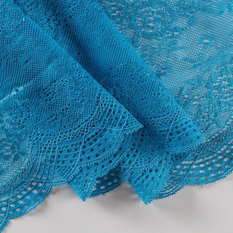Эластичное кружево сочетает в себе мягкость, прочность и красоту, благодаря своей упругости оно долго не теряет первоначальную форму. Используется для пошива нижнего белья, а так же применяется как отделочный декор в одежде.