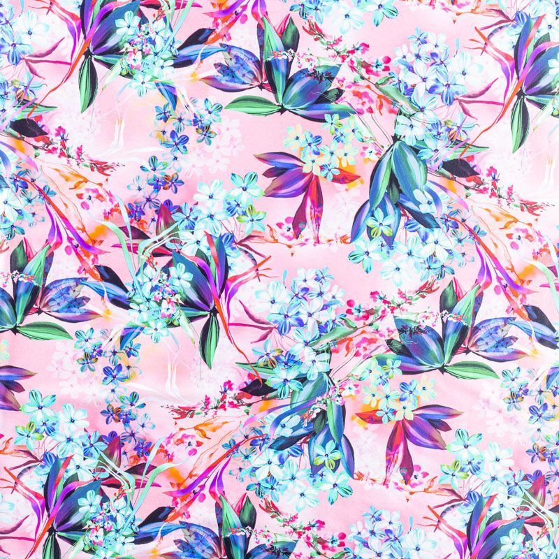 Итальянский бифлекс с цветочным принтом в голубых оттенках на нежном розовом фоне. Поверхность ткани матовая и гладкая. Отлично тянется, одежда из него не сковывает движения. Хорошо впитывает влагу и быстро высыхает, не вызывет аллергии и раздражения. Используется для пошива эстрадных, спортивных костюмов, купальников, боди.