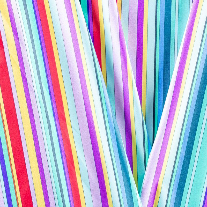 Итальянский бифлекс с разноцветными и разноразмерными полосками. Поверхность ткани матовая и гладкая. Отлично тянется, одежда из него не сковывает движения. Хорошо впитывает влагу и быстро высыхает, не вызывет аллергии и раздражения. Используется для пошива эстрадных, спортивных костюмов, купальников, боди.