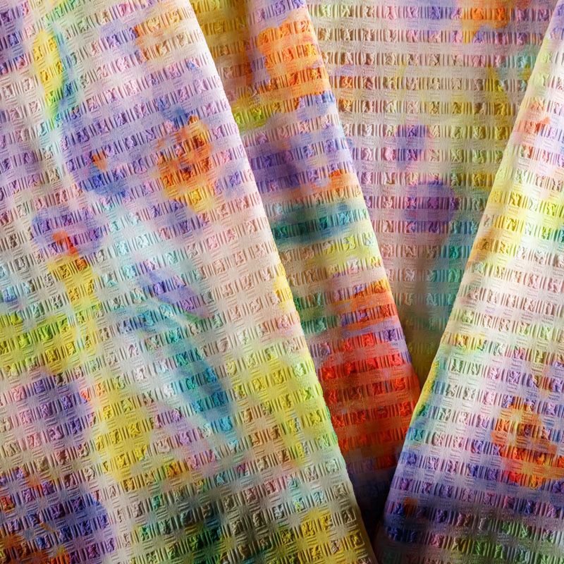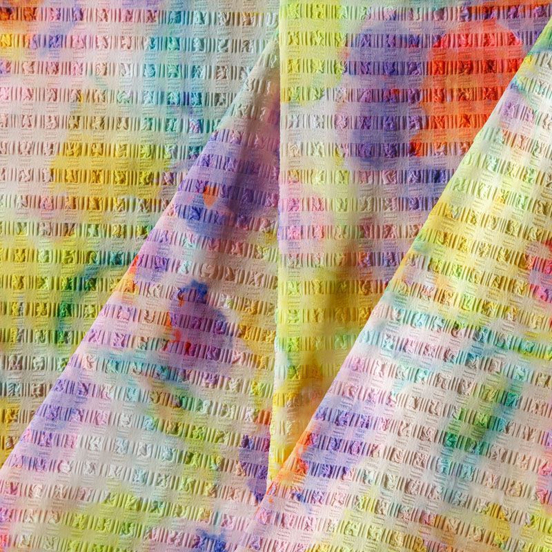 Итальяская качественная, красивая и приятная на ощупь лайкра желтого цвета в цветочным принтом в ярких оттенках. Поверхность ткани матовая, с жаккардовой фактурой и имитацией жатки.  Идеально облегает фигуру, тянется по двум направлениям, хорошо драпируется, отлично держит форму, устойчива к пилингу, долговечна и гигроскопична. Используется для пошива одежды для танцев, гимнастики, фигурного катания, для велоспорта, легкой атлетики и аэробики, фитнеса и других видов спорта, для купальников, женского белья, театральных, цирковых и эстрадных костюмов.