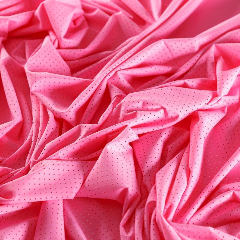 Итальяская качественная, красивая и приятная на ощупь лайкра с перфорацией ярко-розового оттенка. Поверхность ткани матовая, гладкая, шелковистая на ощупь. Идеально облегает фигуру, тянется по двум направлениям, хорошо драпируется, отлично держит форму, устойчива к пилингу, долговечна и гигроскопична. Используется для пошива одежды для танцев, гимнастики, фигурного катания, для велоспорта, легкой атлетики и аэробики, фитнеса и других видов спорта, для купальников, женского белья, театральных, цирковых и эстрадных костюмов.