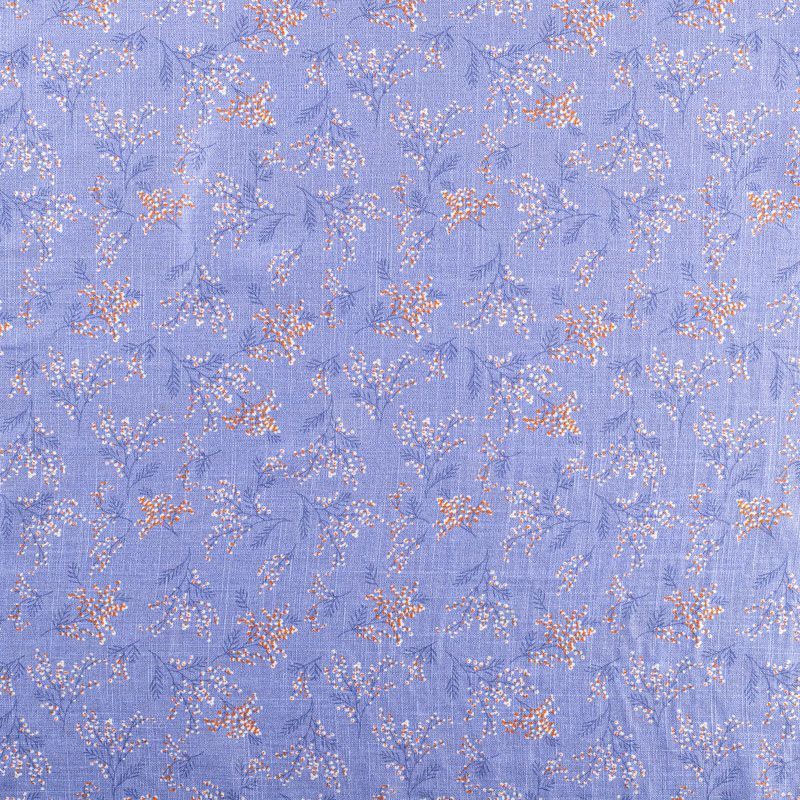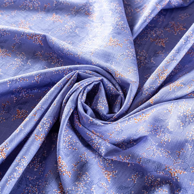 Льняная плательная ткань с добавлением вискозы оттенка лаванды с растительным принтом. Материал прочный, с выразительной матовой рельефной поверхностью, полотняным плетением, хорошо держит форму, мягкий на ощупь, пластичный, отлично драпируется. Прекрасно подойдет для пошива летних платьев, сарафанов, юбок, рубашек, брюк и шорт.