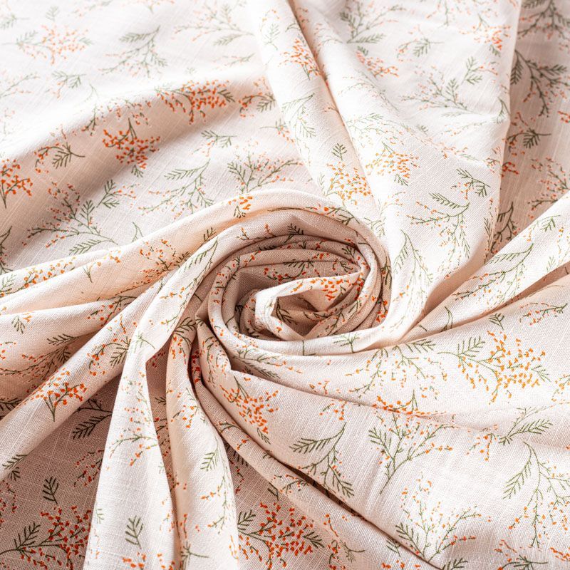 Льняная плательная ткань с добавлением вискозы цвета экрю с растительным принтом. Материал прочный, с выразительной матовой рельефной поверхностью, полотняным плетением, хорошо держит форму, мягкий на ощупь, пластичный, отлично драпируется. Прекрасно подойдет для пошива летних платьев, сарафанов, юбок, рубашек, брюк и шорт.