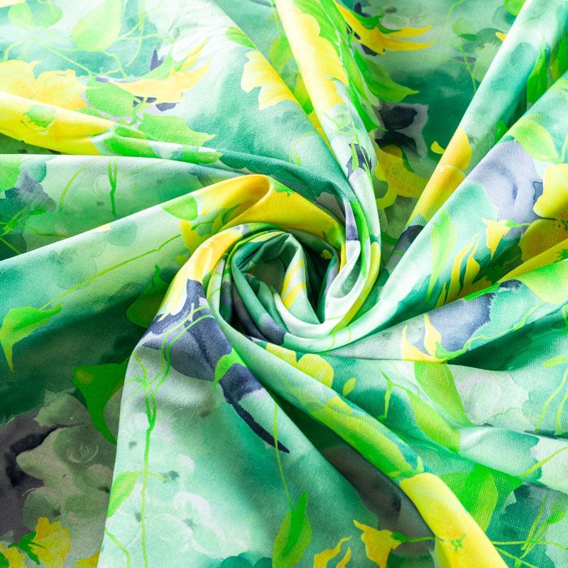 Льняная плательно-рубашечная ткань с добавлением бемерии в зеленых оттенках с цветочным акварельным принтом. Материал прочный, с выразительной матовой рельефной поверхностью, полотняным плетением, хорошо держит форму, мягкий на ощупь, пластичный, отлично драпируется. Прекрасно подойдет для пошива летних платьев, сарафанов, юбок, рубашек, брюк и шорт.