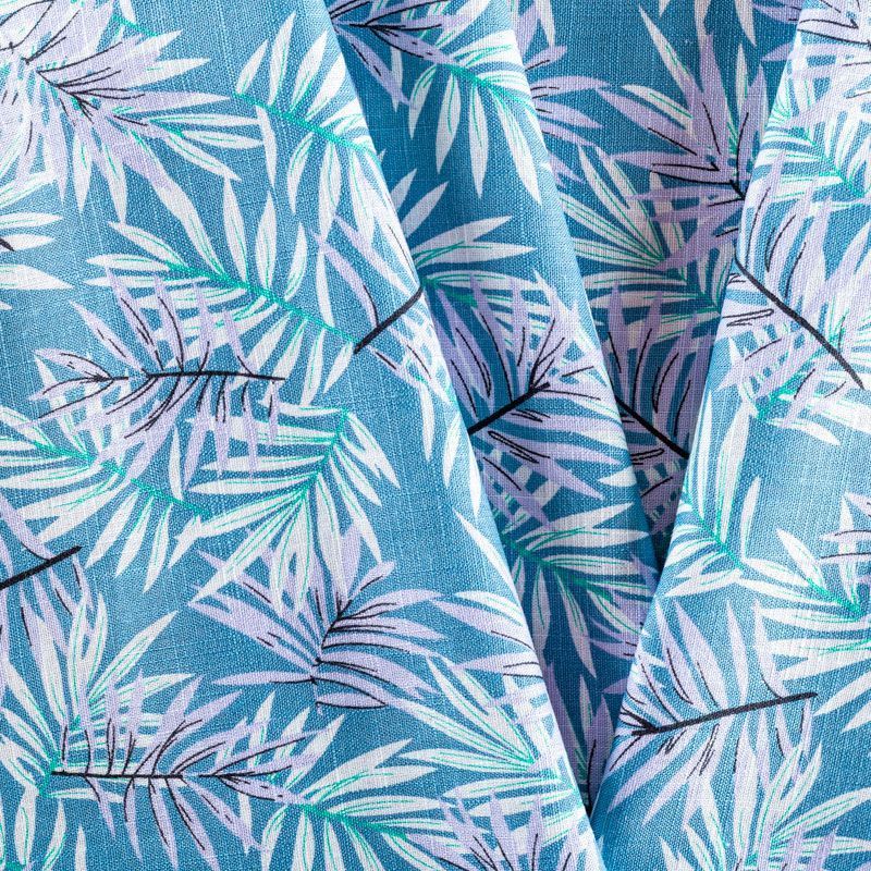 Льняная плательная ткань с добавлением вискозы темно-голубого цвета с растительным принтом. Материал прочный, с выразительной матовой рельефной поверхностью, полотняным плетением, хорошо держит форму, мягкий на ощупь, пластичный, отлично драпируется. Прекрасно подойдет для пошива летних платьев, сарафанов, юбок, рубашек, брюк и шорт.