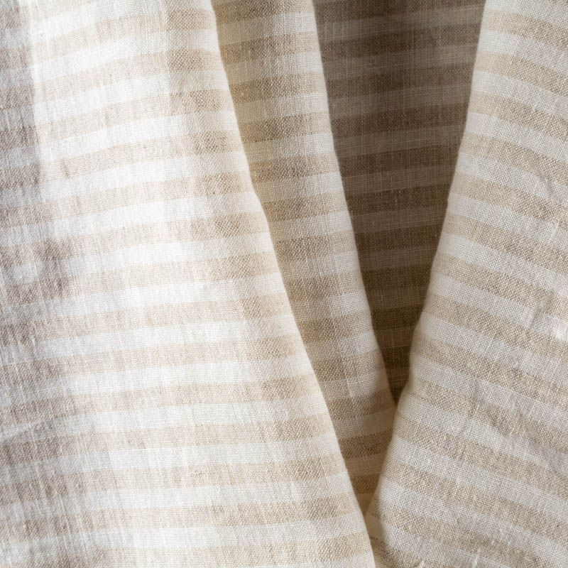 Прочный, выразительная матовая рельефная поверхность, полотняное переплетение, хорошо держит форму, мягкий на ощупь, пластичный, отлично драпируется. Прекрасно подойдет для пошива летних платьев, сарафанов, юбок, рубашек, брюк и шорт. Льняная плательная ткань с серой полоской. Ширина полоски - 1 см.