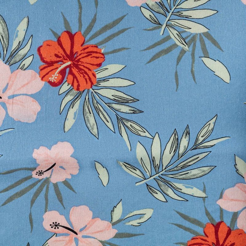 Прочный, выразительная матовая рельефная поверхность, полотняное переплетение, отлично держит форму, жестковатый на ощупь, но комфортный в изделии. Стильный вариант для платьев-футляров, сарафанов, юбок, жакетов, брюк или шорт. Льняная костюмно-плательная ткань с крупным цветочным принтом красно-коралловых оттенков на голубом фоне.