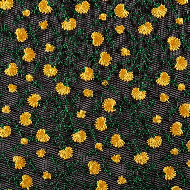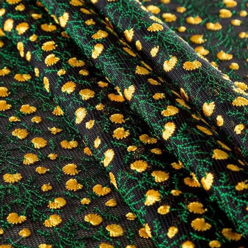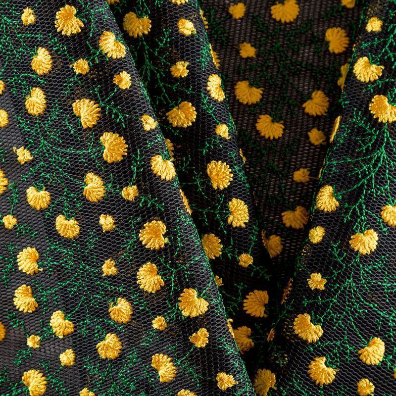 Объемный, эластичный материал черного цвета, состоящий из двойной мелкой сетки, по форме напоминающей соты, украшенный "богатой" цветочной вышивкой. Упругое, мягкое с полупрозрачной фактурой полотно, пластичное и довольно прочное. Хорошо тянется, легкое и комфортное. Отлично держит форму. Рекомендуется для пошива объемных изделий или элементов: эксклюзивного жакета, бомбера, платья, юбки.