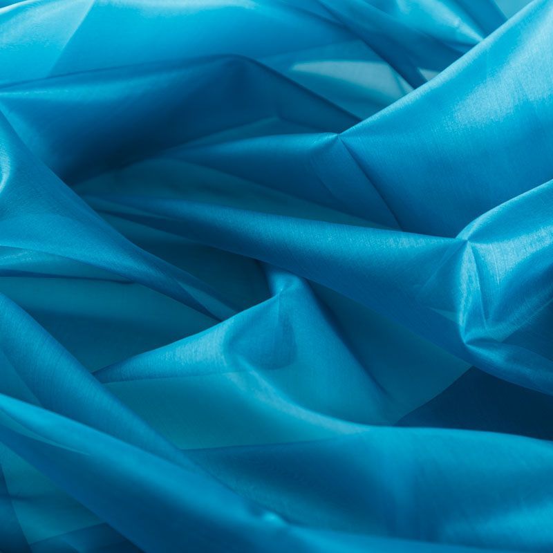 Шелковая невесомая органза с искрящейся поверхностью сине-зеленого оттенка. Ткань легкая, тонкая, пластичная, хорошо драпируется, просвечивает, отлично держит форму. Подойдет на блузку, рубашку, платье, тунику или юбку на подкладе.