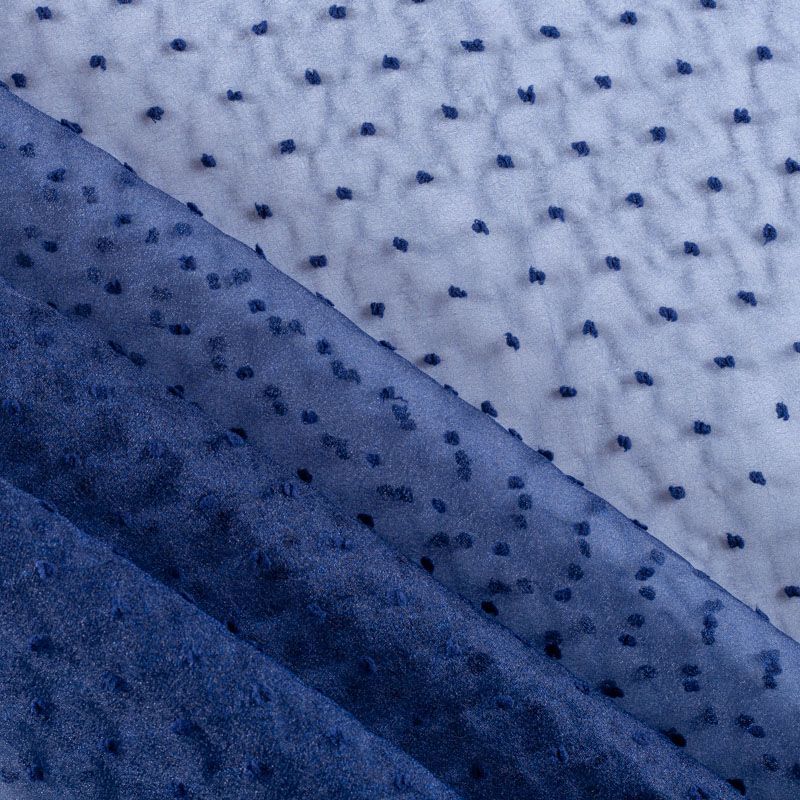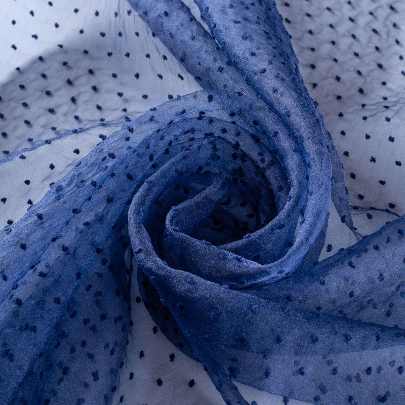 Легчайший, изящный, воздушнный и прозрачный материал с благородной переливчатой поверхностью. Прекрасно держит форму в заложеных складках. На лицевой стороне объемные декоративные элементы из флока диаметром 0.5 см. Подойдет для создания в изделии декоративных деталей, новогодних костюмов, нарядных платьев, блузок.