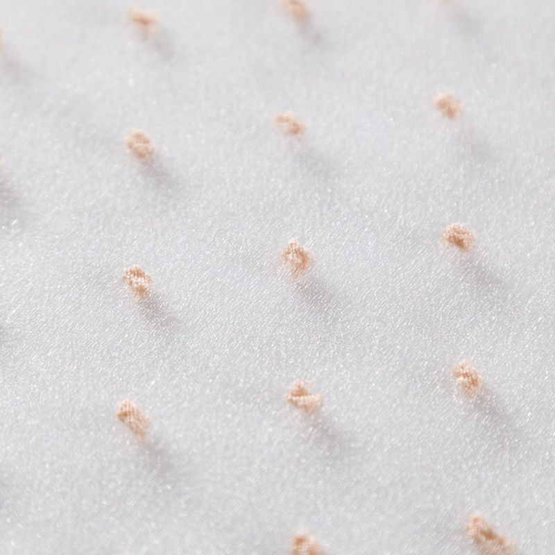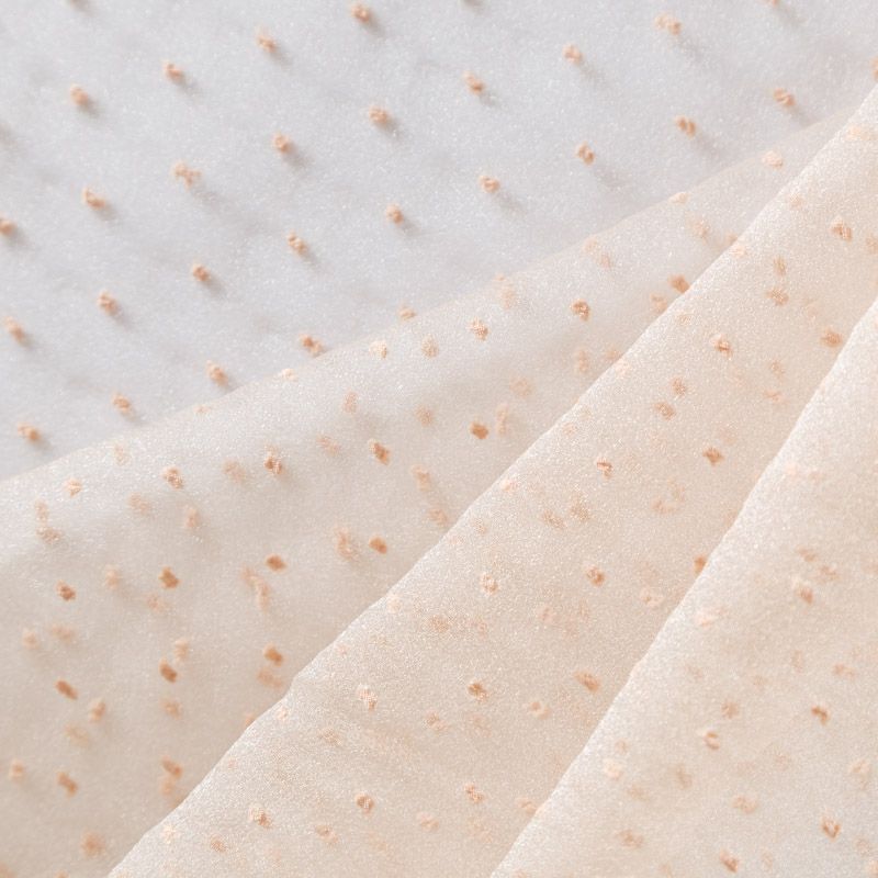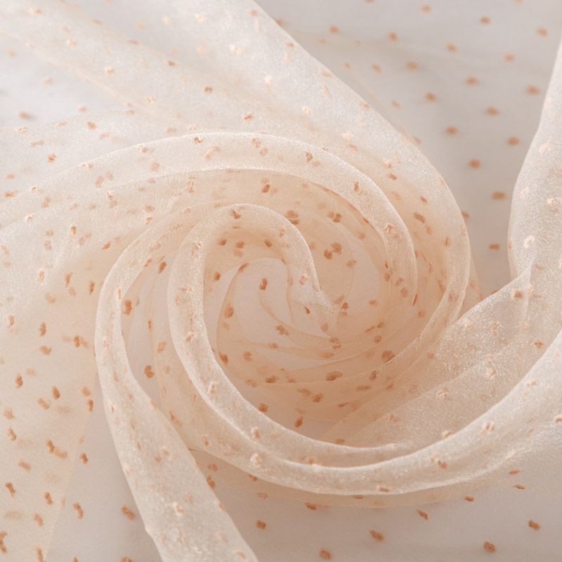 Легчайший, изящный, воздушнный и прозрачный материал с благородной переливчатой поверхностью. Прекрасно держит форму в заложеных складках. На лицевой стороне объемные декоративные элементы из флока диаметром 0.5 см. Подойдет для создания в изделии декоративных деталей, новогодних костюмов, нарядных платьев, блузок.