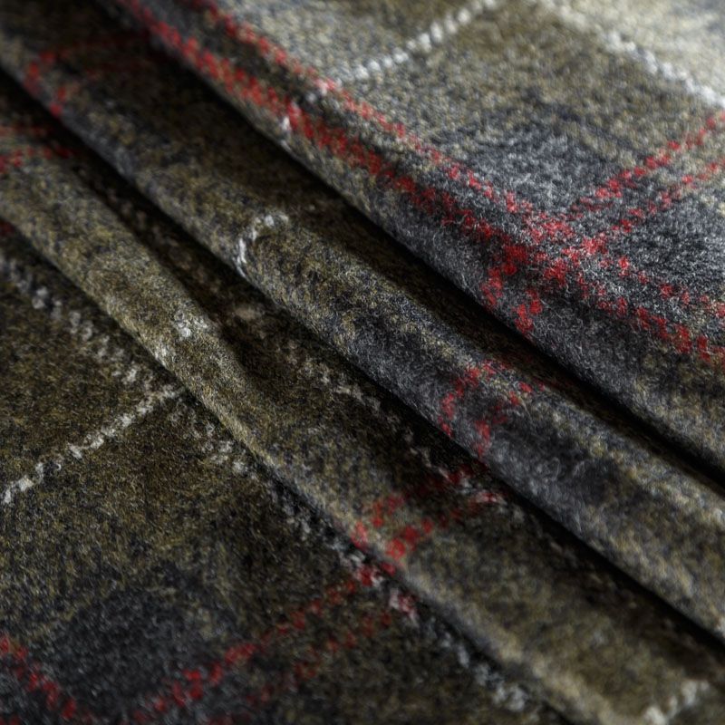 Плотный пальтовый шерстяной трикотаж в оттенке хаки. Линии белого, красного и серого цветов образуют красивую клетку. Обе стороны ткани гладкие, приваляные, срезы не осыпаются, хорошо держит форму, теплый. Идеален для пошива пальто,теплых жакетов, жилетов, кейпа, кардигана.