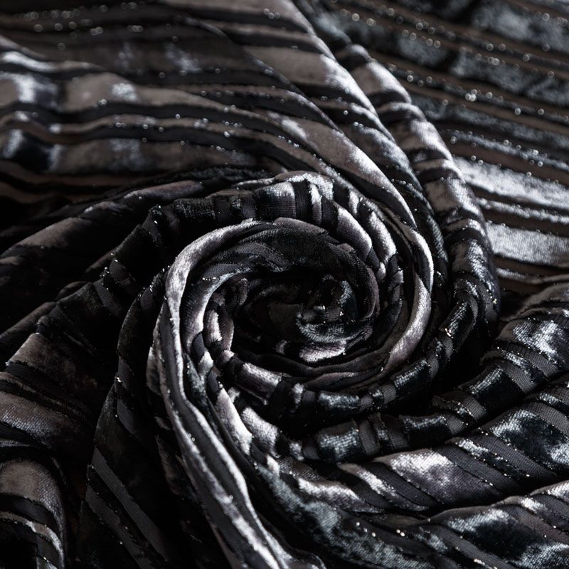 Итальянская шелковая красивая и эффектная ткань с гладким, немного глянцевым ворсовым узором на матовой шифоновой основе черного цвета. Панбархат тонкий, но объемный за счет рельефности рисунка, при драпировке ложится мягкими струящимися складками. Отлично подойдет для пошива блузы, туники, платья, костюма в пижамном стиле.