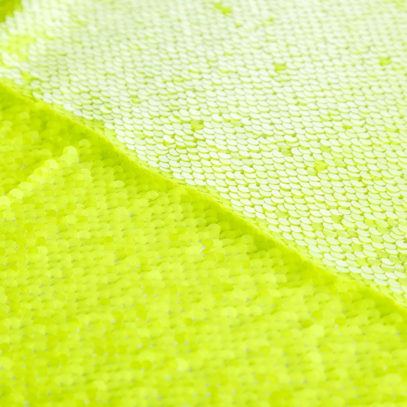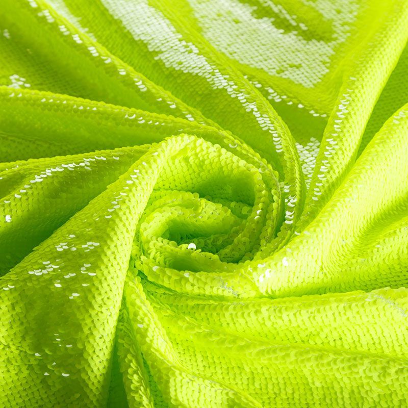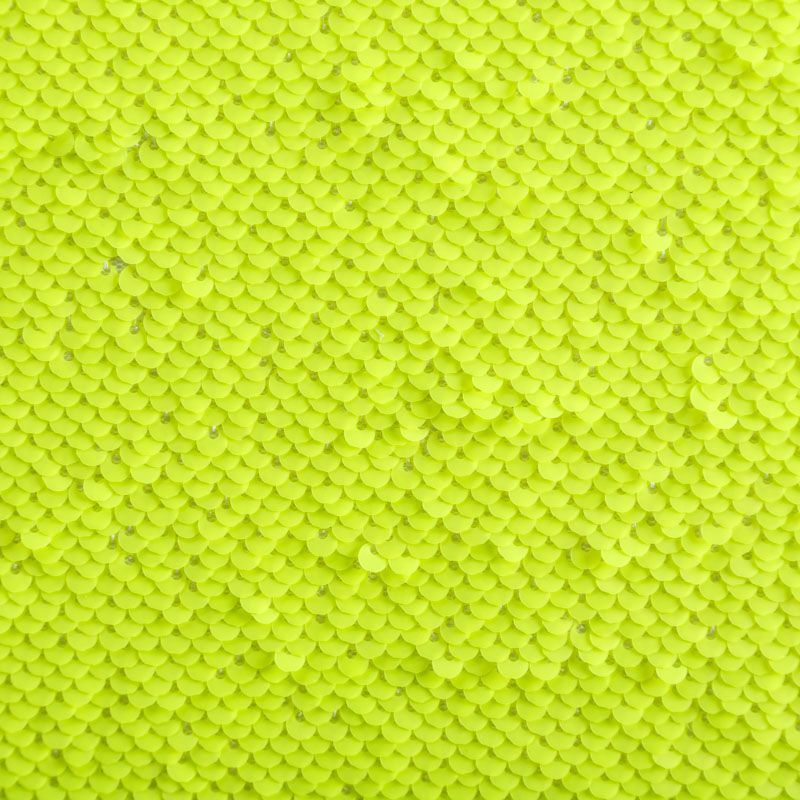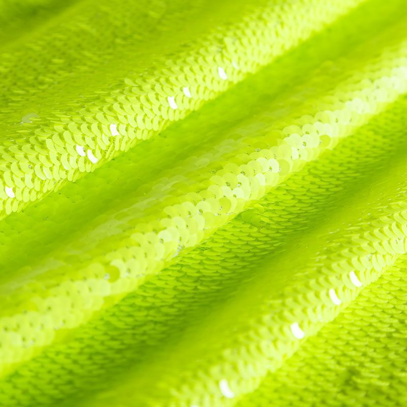 Двухсторонние пайетки неонового желто-зеленого оттенка, вышиты по типу чешуи на эластичной трикотажной основе белого цвета. Лицевая сторона глянцевая, изнаночная — матовая. Ткань яркая и выразительная, красиво переливается, очень нарядная, хорошо драпируется, пластичная и эластичная и в длину, и в ширину, благодаря чему изделия получаются комфортными и отлично сидят по фигуре. Пайетки — идеальный материал для праздников и вечеринок, также отлично впишутся в стиль "спорт-шик". Из них получится эффектное платье, жакет, боди, топ, туника, юбка или комбинезон.