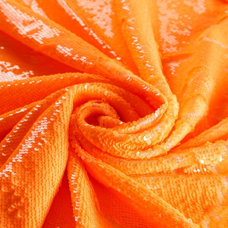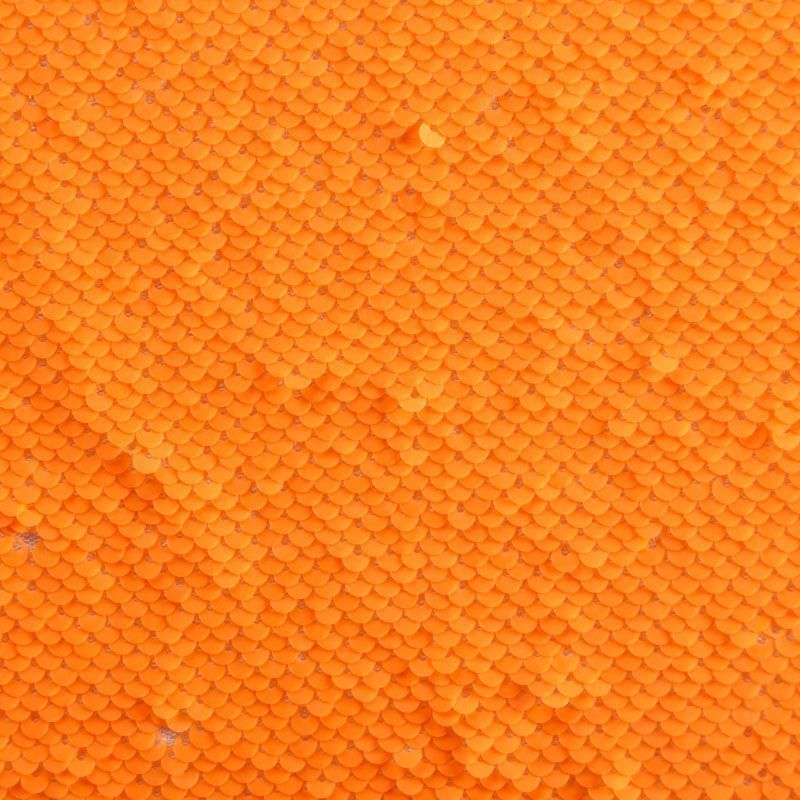 Двухсторонние пайетки неонового оранжевого оттенка, вышиты по типу чешуи на эластичной трикотажной основе белого цвета. Лицевая сторона глянцевая, изнаночная — матовая. Ткань яркая и выразительная, красиво переливается, очень нарядная, хорошо драпируется, пластичная и эластичная и в длину, и в ширину, благодаря чему изделия получаются комфортными и отлично сидят по фигуре. Пайетки — идеальный материал для праздников и вечеринок, также отлично впишутся в стиль "спорт-шик". Из них получится эффектное платье, жакет, боди, топ, туника, юбка или комбинезон.