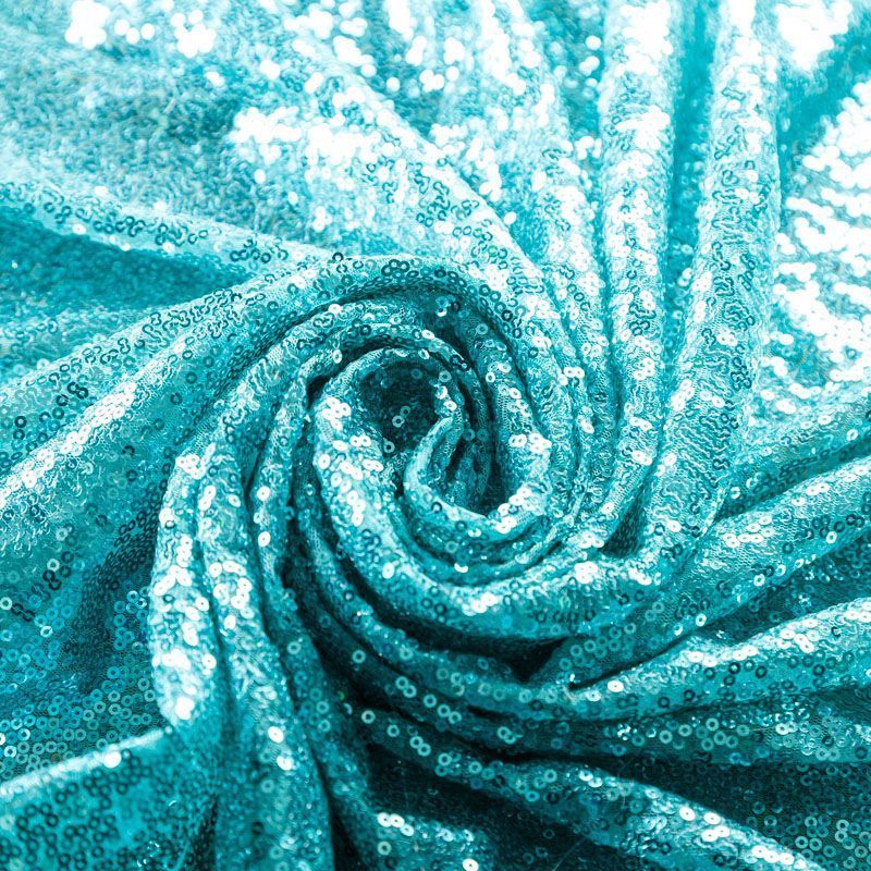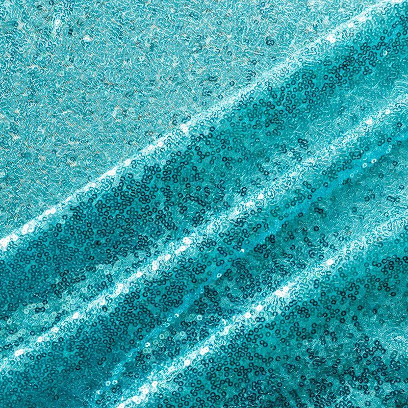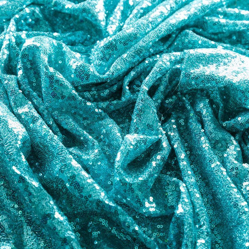 Блестящие пайетки в бирюзовом оттенке. Мелкие, размером около 3 мм, расположены в хаотичном порядке. Основа - мягкая и эластичная сетка.  Ткань полупрозрачная, может потребоваться подклад. Подойдет для вечернего, коктейльного платья, юбки, нарядных детских изделий, танцевальных и сценических костюмов.