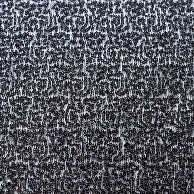 Тонкая эластичная сетка черного цвета расшита мелкими глянцевыми пайетками в тон основе. Ткань очень хорошо драпируется, красиво переливается, пластичная и эластичная и в длину, и в ширину, благодаря чему изделия получаются комфортными и отлично сидят по фигуре. Пайетки — идеальный материал для праздников и вечеринок. Из них получится эффектное платье, жакет, боди, топ, туника, юбка или комбинезон.
