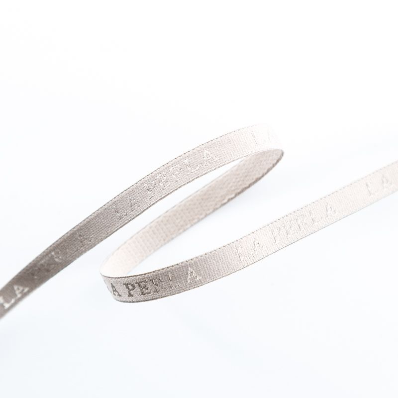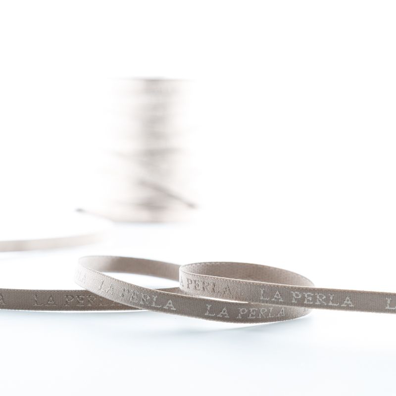 Бретелечная резинка используется для обработки стана бюстгальтера, а также для бретелей. Матовая с жаккардовой надписью бренда. Края ровные.