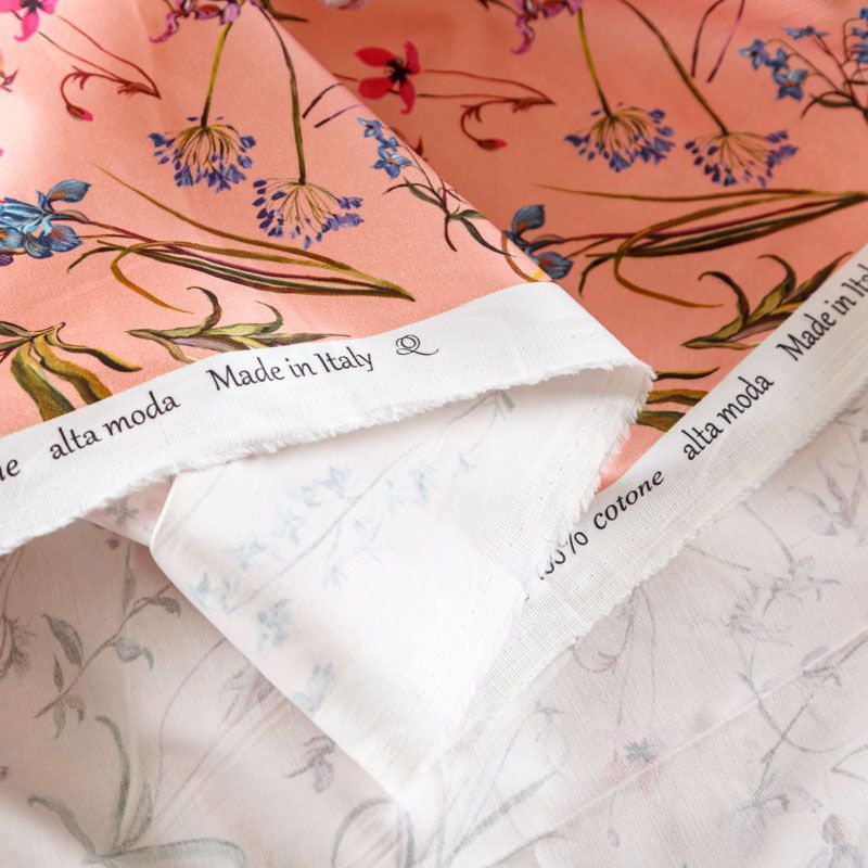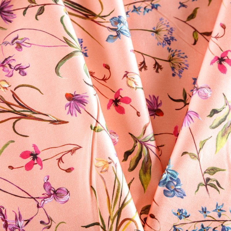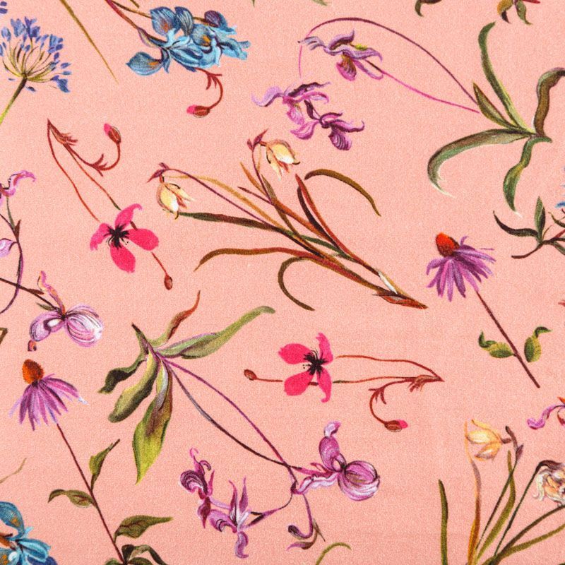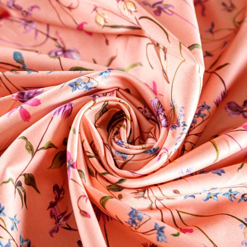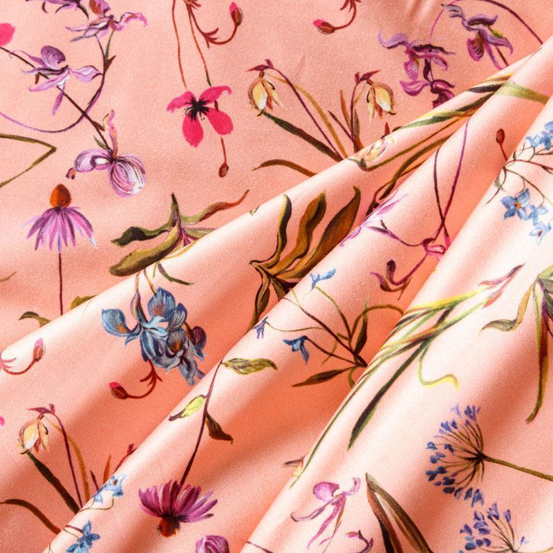 Итальянский сатин-коттон персиково-розового оттенка с цветочным принтом. Поверхность гладкая со сдержанным блеском, ткань средней плотности,  не толстая, хорошо держит форму, тянется за счет эластана в составе. Подойдет для пошива костюма, жакета, юбки, платья, брюк или шорт.