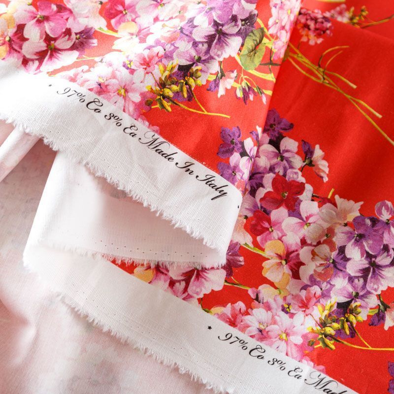 Итальянский сатин-коттон в красном оттенке с цветочным принтом. Поверхность гладкая со сдержанным блеском, ткань средней плотности,  не толстая, хорошо держит форму, тянется за счет эластана в составе. Подойдет для пошива костюма, жакета, юбки, платья, брюк или шорт.