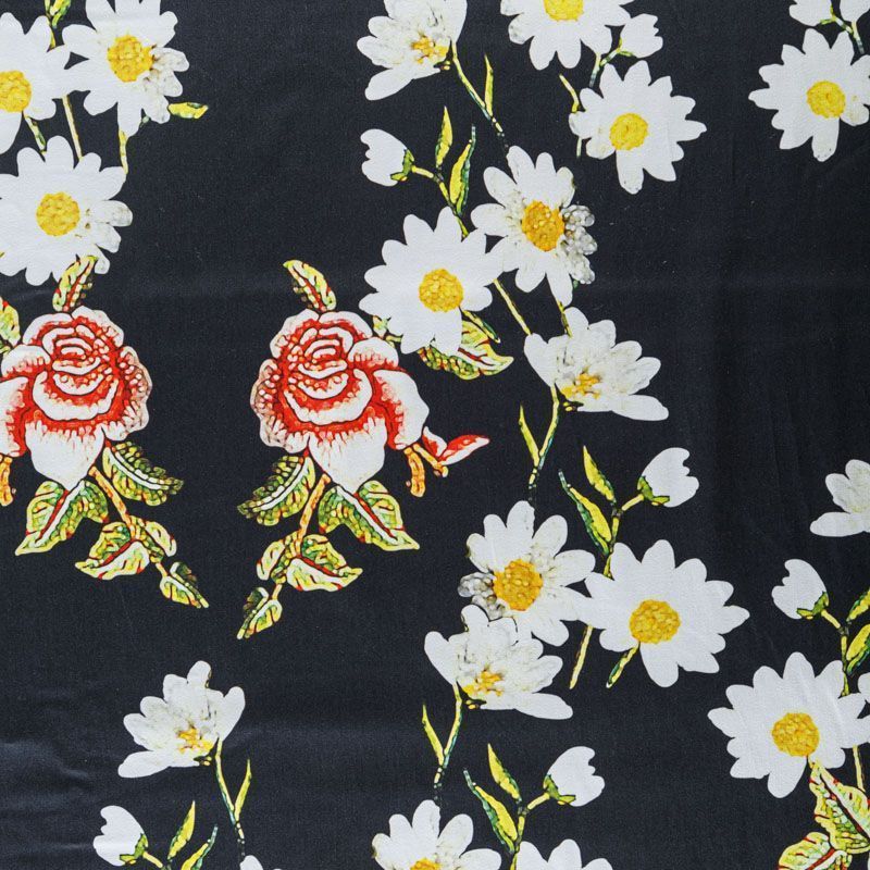 Итальянский сатин-коттон в черном оттенке с цветочным принтом. Поверхность гладкая со сдержанным блеском, ткань средней плотности,  не толстая, хорошо держит форму, тянется за счет эластана в составе. Подойдет для пошива костюма, жакета, юбки, платья, брюк или шорт.