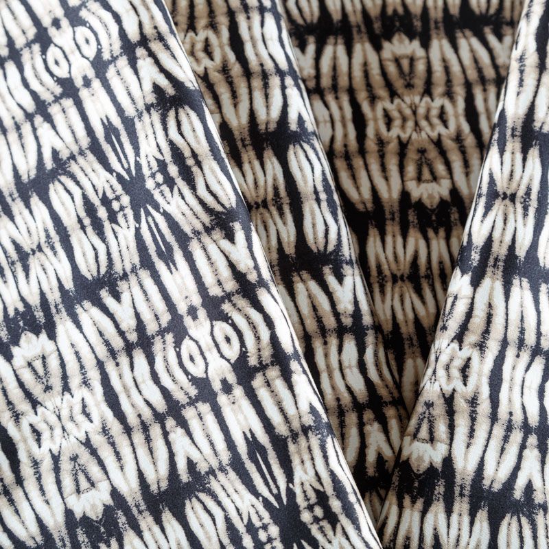Итальянский сатин-коттон в серо-бежевых оттенках с абстрактным принтом. Поверхность гладкая со сдержанным блеском, ткань средней плотности,  не толстая, хорошо держит форму, тянется за счет эластана в составе. Подойдет для пошива костюма, жакета, юбки, платья, брюк или шорт.