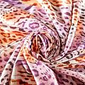 Сатин-коттон в сиреневом оттенке со стилизованным анималистическим принтом, с гладкой поверхностью со сдержанным блеском, ткань средней плотности,  не толстая, хорошо держит форму, тянется за счет эластана в составе. Подойдет для пошива костюма, жакета, юбки, платья, брюк или шорт.