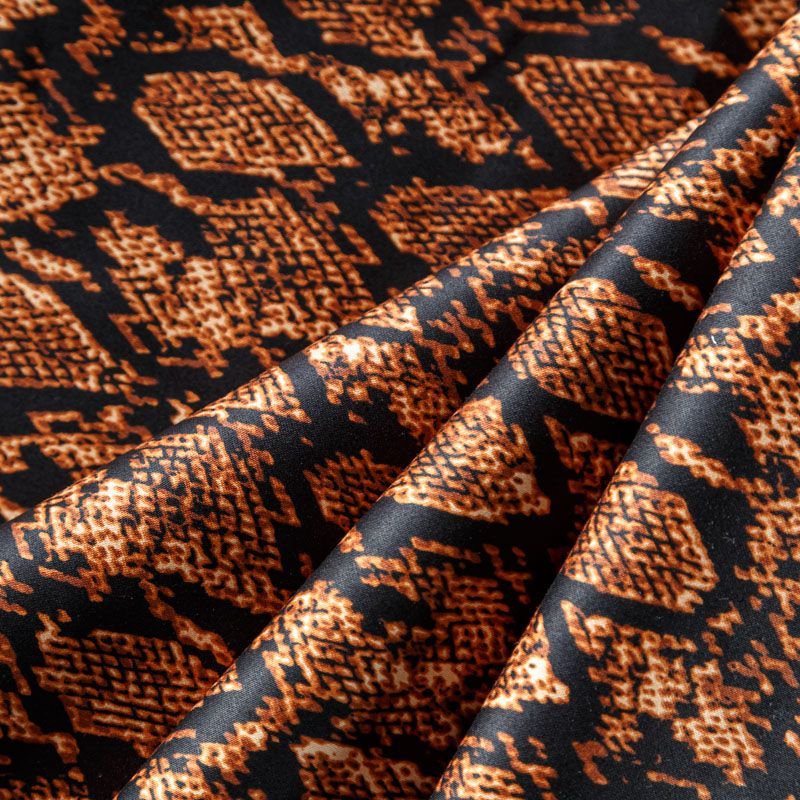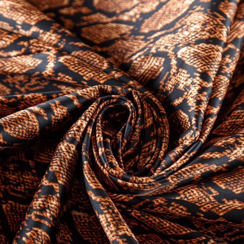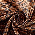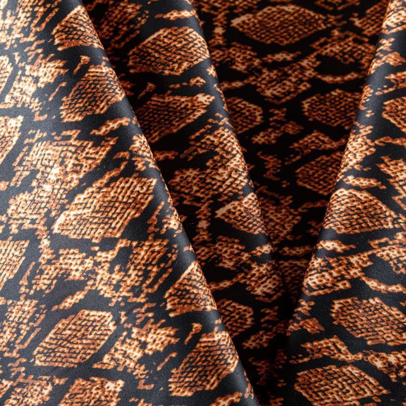 Сатин-коттон черного цвета со стилизованным анималистическим принтом, с гладкой поверхностью со сдержанным блеском, ткань средней плотности, не толстая, хорошо держит форму, тянется за счет эластана в составе. Подойдет для пошива костюма, жакета, юбки, платья, брюк или шорт.