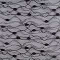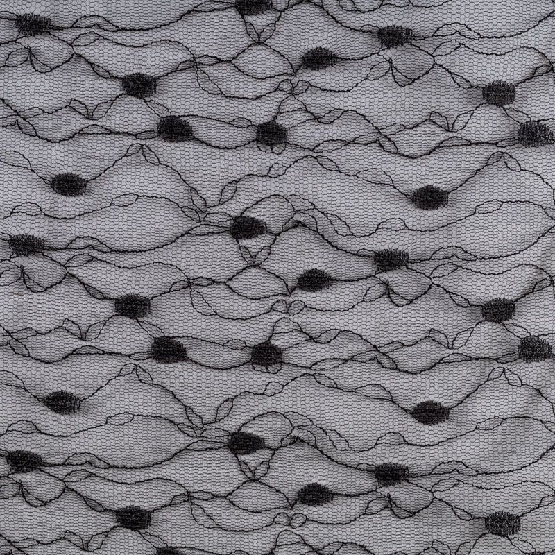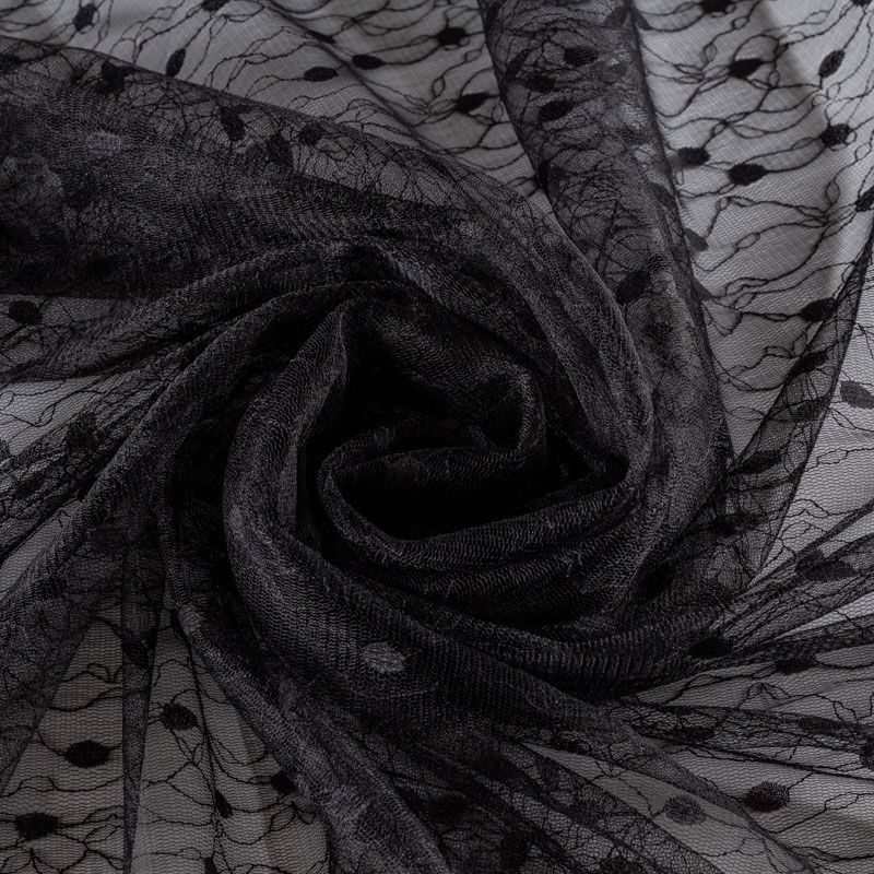 Тонкое, нежное, мягкое и прозрачное полотно, состоящее из мелких ячеек, на которых нанесен рельефный плетеный растительный принт.  Красиво драпируется, тянется, применяется для декорирования деталей одежды, например, рукавов изделия, для пошива нарядной и повседневной одежды: топов, блузок, пышных юбок и платьев.