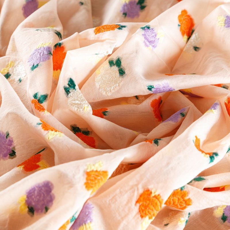 Очень красивый и нежный шелковый батист с цветочной вышивкой. Ткань тонкая, мягкая и легкая, но достаточно плотная, не очень прозрачная, ее прикосновения к телу очень приятны, в изделии из него будет комфортно как в жару, так и в прохладную погоду. Лицевая сторона гладкая, с легким сатиновым блеском. Прекрасно подойдет для пошива летнего сарафана, платья, блузки, топа, туники, костюма в пижамном стиле, широких брюк или юбки.