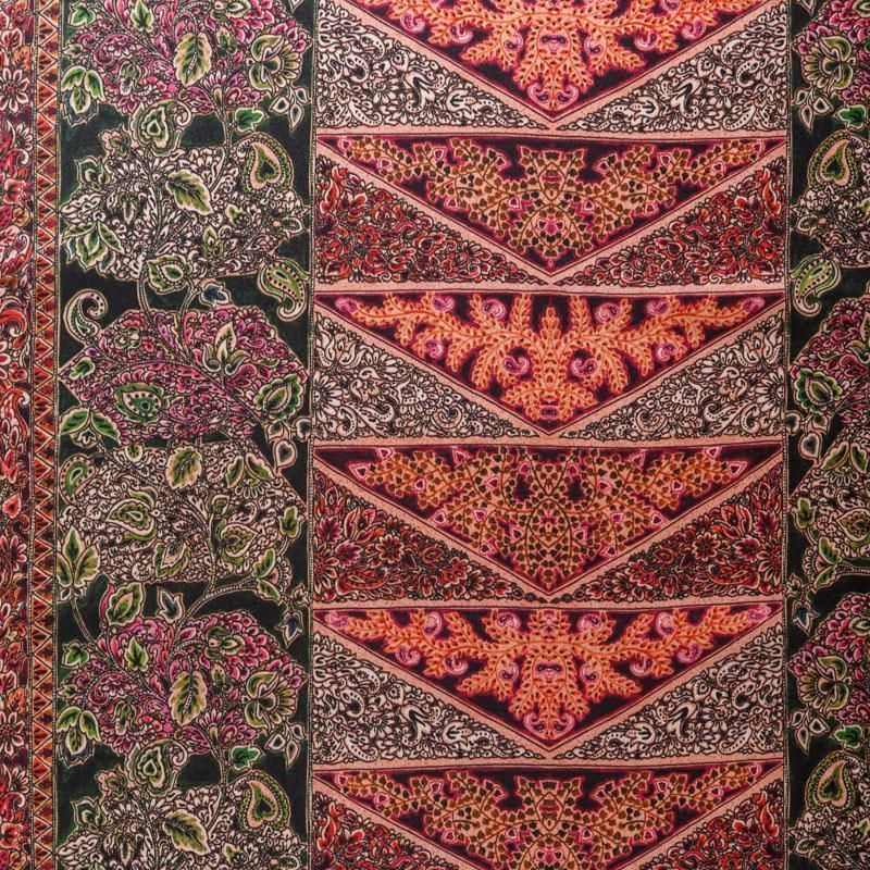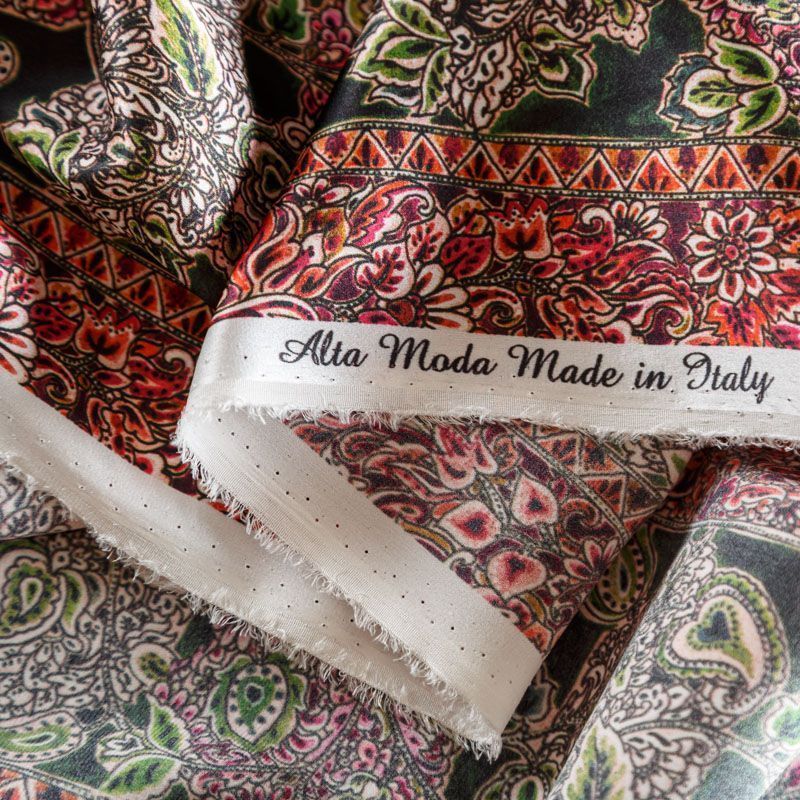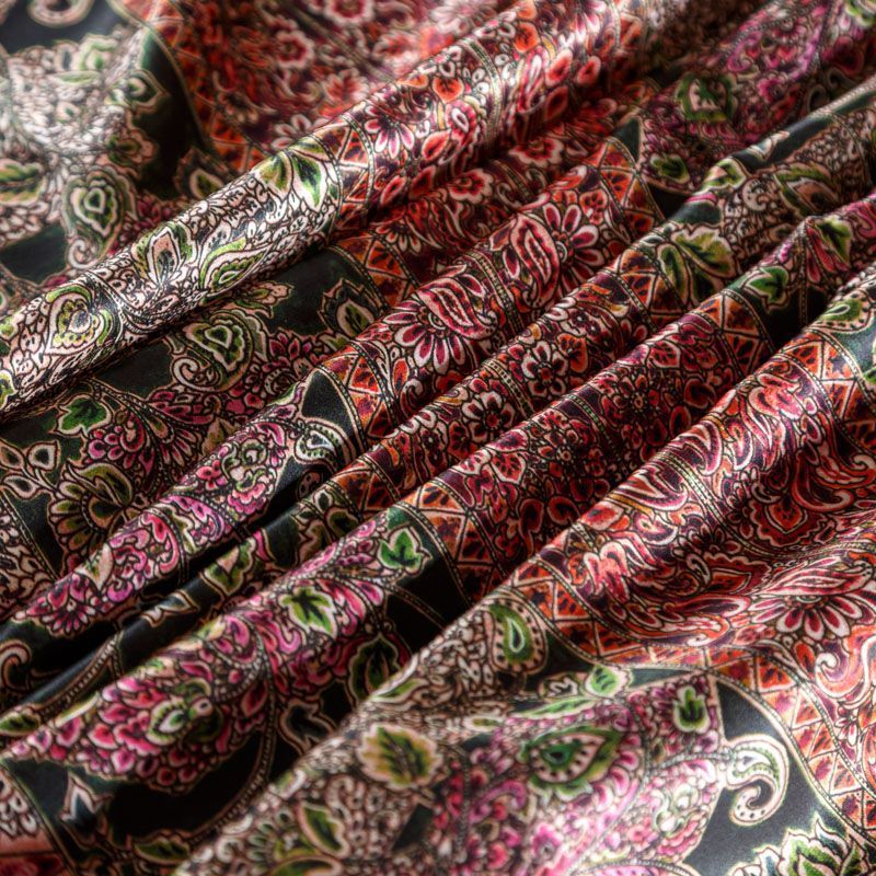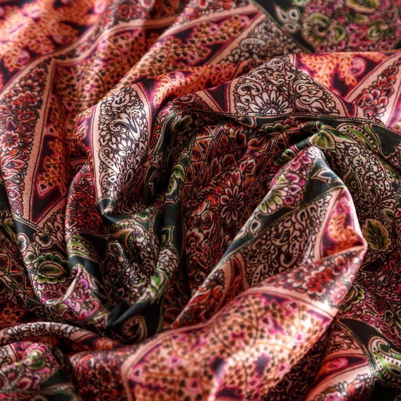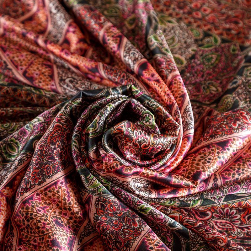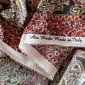 Итальянский атласный шелк с богатым орнаментом в красно-коралловых оттенках.  Ткань тонкая, не просвечивает, отлично драпируется, легкая и струящаяся, тянется за счет эластана в составе. Идеально подойдет для пошива платьев и сарафанов расклешенных моделей, с воланами, летящих юбок, топов, блузки, костюма в пижамном стиле.